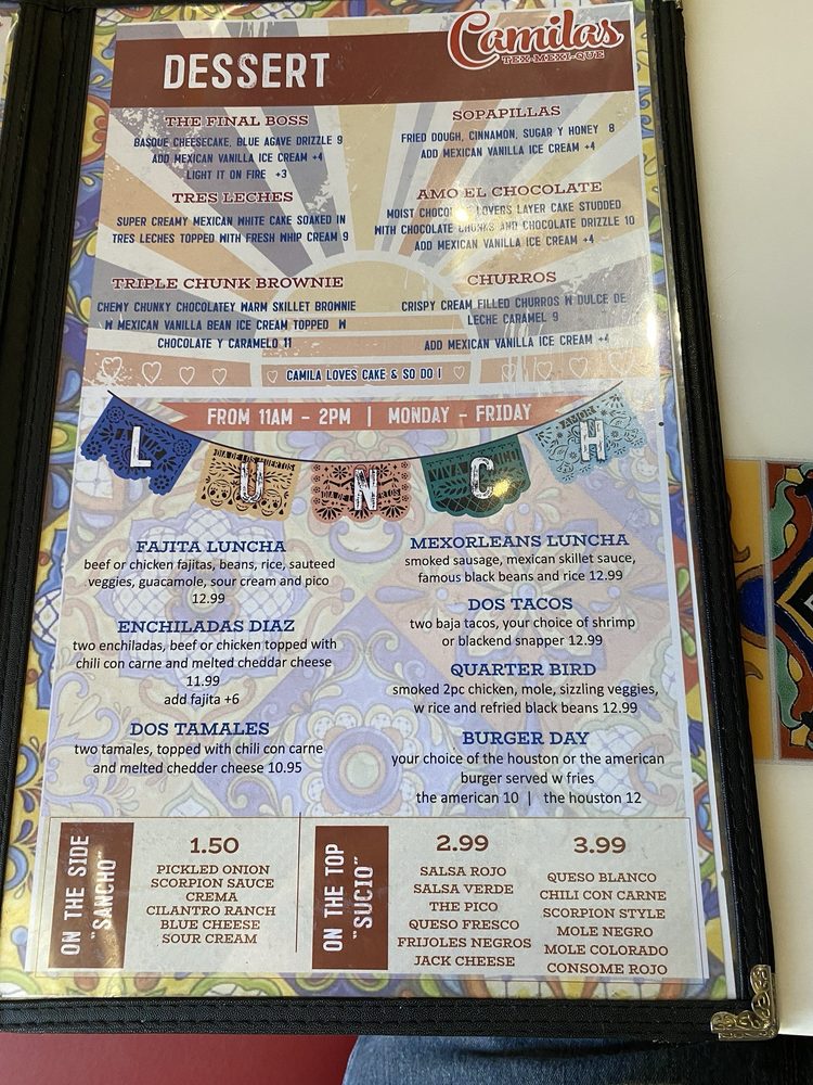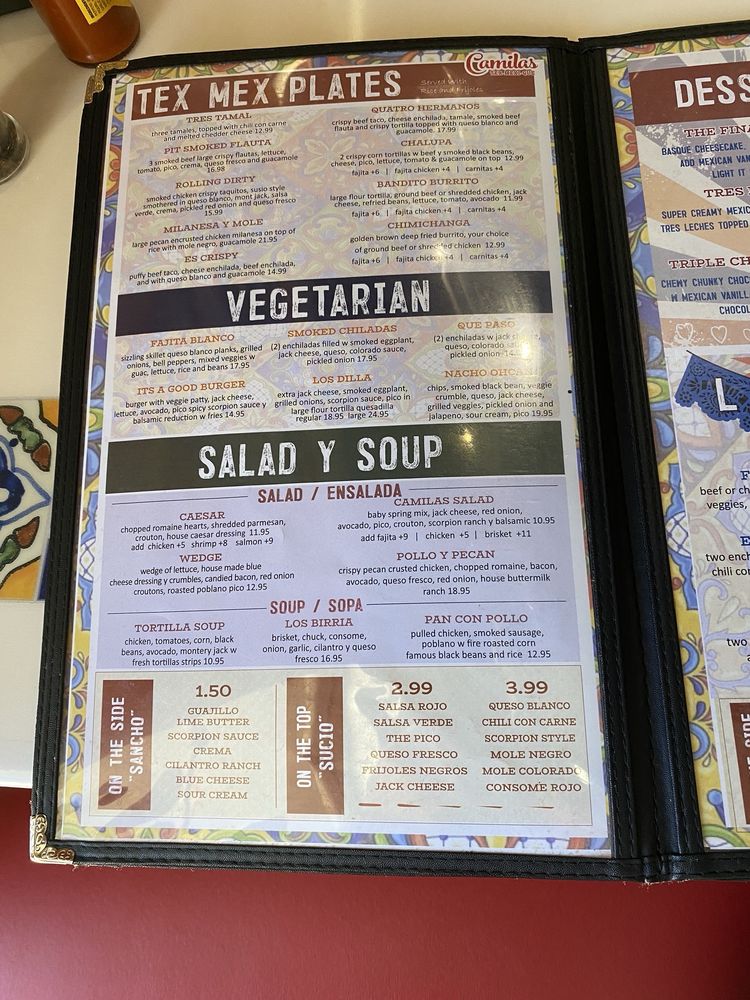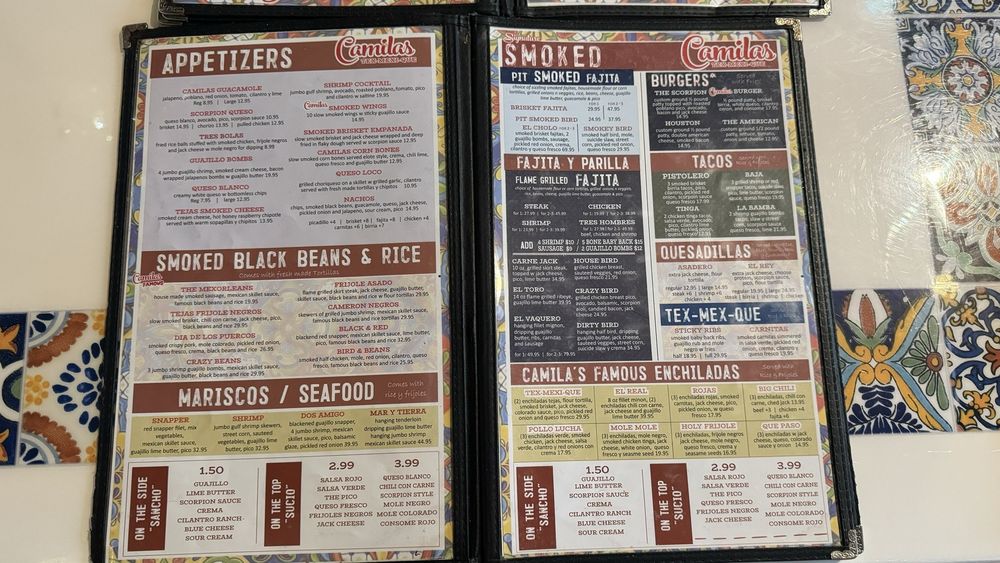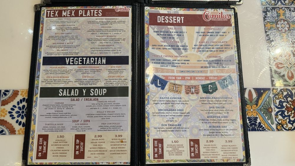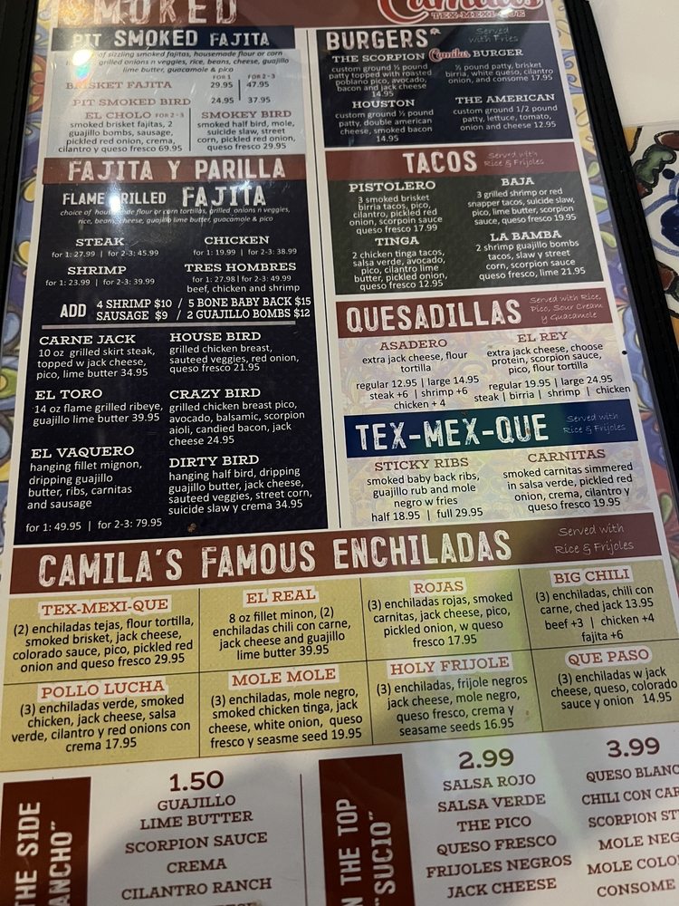 Camila's Tex-Mexi-Que is a hidden gem in Conroe, TX, offering a unique blend of Tex-Mex and barbeque cuisine. With a vibrant atmosphere and attentive wait staff, this spot is perfect for sports fans and food enthusiasts alike. Try the Queso Loco for a creamy and flavorful start, or indulge in the Camilarita, a high-quality Tex-Mex margarita like no other. The brisket quesadilla is a must-try, with tender meat that melts in your mouth. End your meal with the Tres leches cake or churros for a sweet treat that won't disappoint. With large servings and a diverse menu, Camila's Tex-Mexi-Que is sure to impress both your taste buds and your guests.